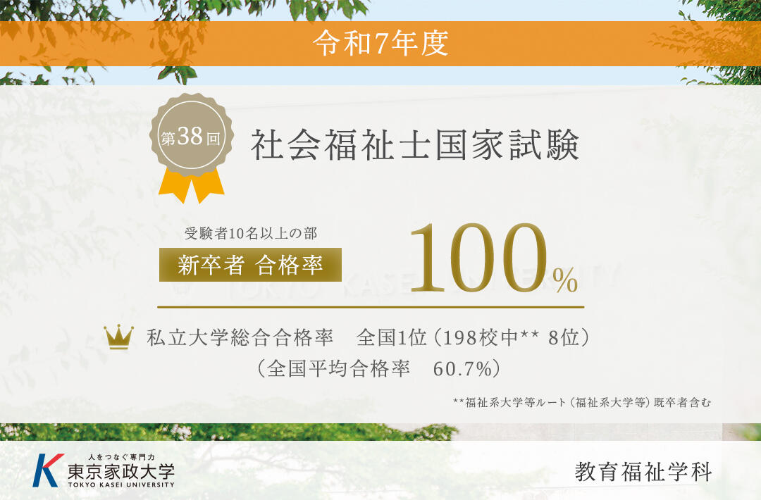 教育福祉学科は、第38回社会福祉士国家試験において、 私立大学総合合格率 *全国1位(全国198校中**8位)/ 新卒者合格率100%を達成しました! (*既卒者・新卒者を含む総数) (**福祉系大学等ルート[福祉系大学等]既卒者含む) ※受験者10名以上の部