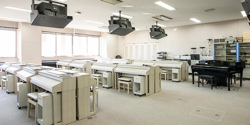 専用に開発された電子ピアノを40台設置。ヘッドホンとマイクを使用した個別指導が受けられます。