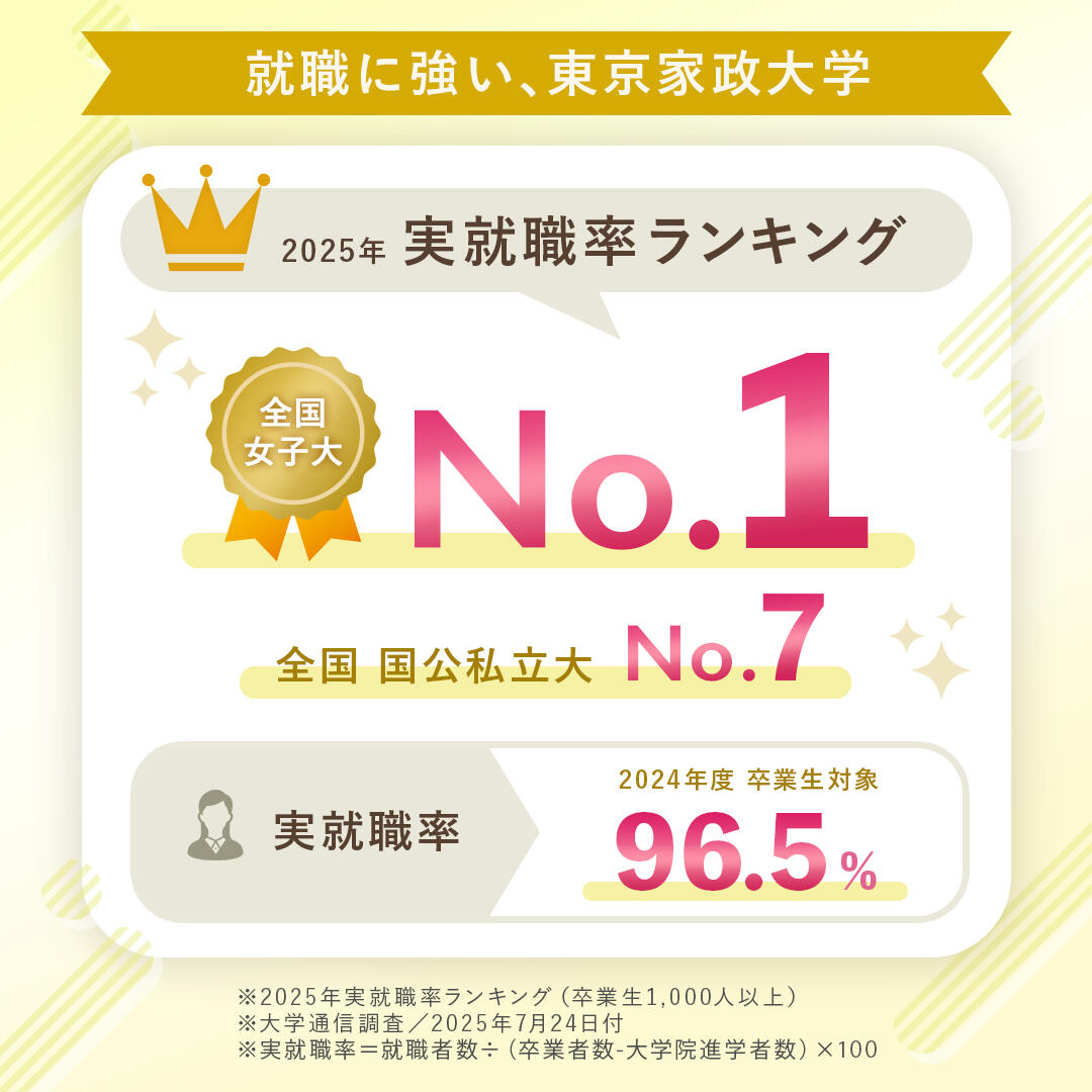 東京家政大学の2024年度卒業生の実就職率(96.5%)が、「2025年実就職率ランキング」で、全国女子大学1位を達成しました。(大学通信調査/7月24日付)。