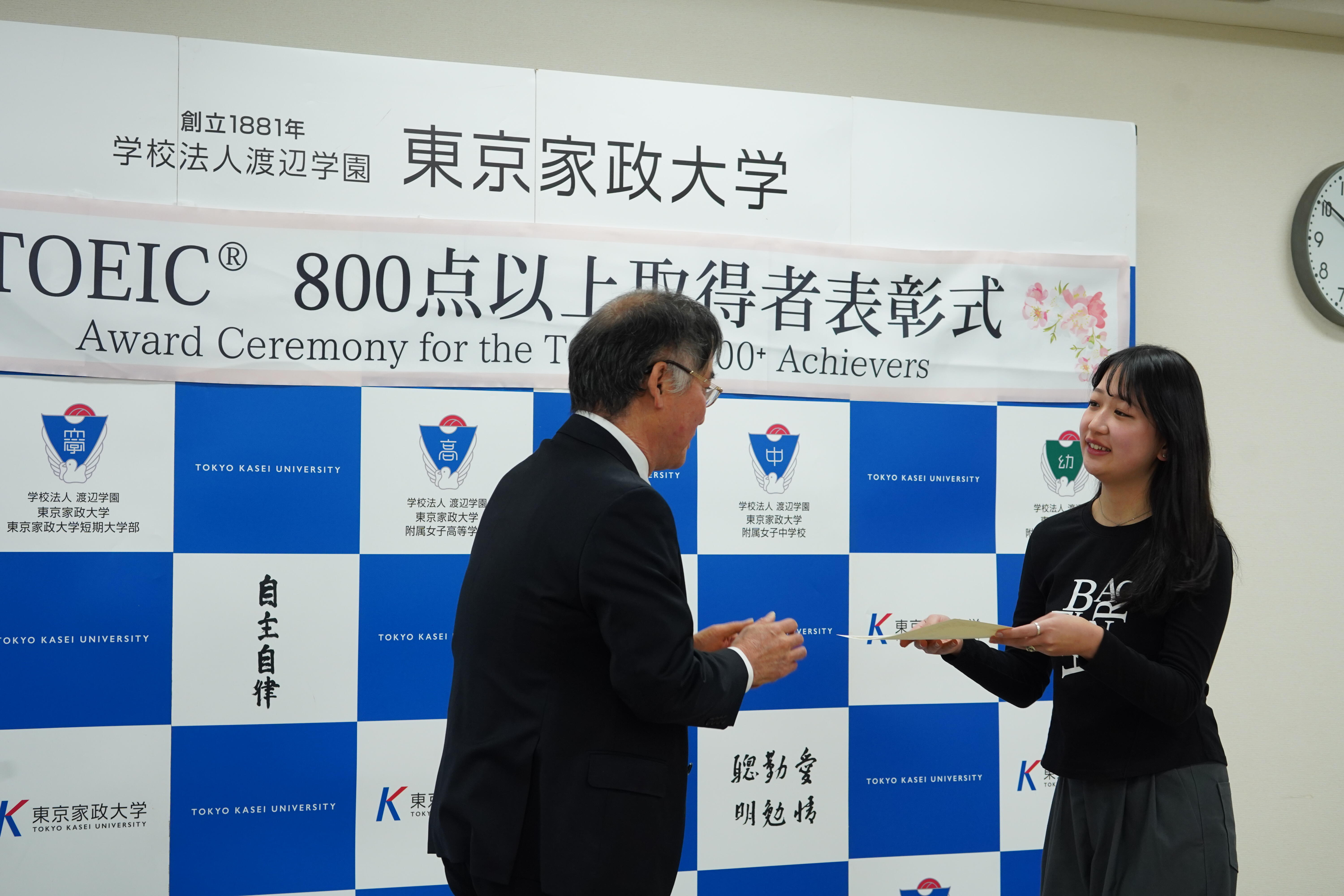 東京家政大学では、在学中にTOEIC®で優秀な成績(800点以上)を収めた学生に対し、毎年英語学習奨励金を授与しています。